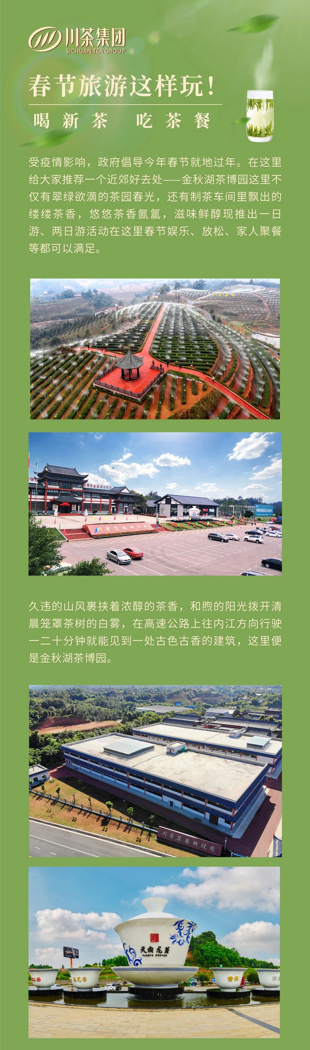 川茶集团金秋湖旅游景区简介 川茶集团金秋湖旅游景区位于世界著名茶乡、中国早茶之乡——宜宾国家农业科技园区核心区的川茶集团科技园,与蜀南竹海、兴文石海、李庄古镇、五粮液等著名景点同处1小时环线旅游圈,区位优势明显。并与规划中的翠屏新区接壤,内宜高速公路穿境而过,距中心城区14公里,距机场20公里,距高铁宜宾东站仅有29公里,交通极为便利。 金秋湖旅游景区依山傍水、环境优越,既有郁郁葱...